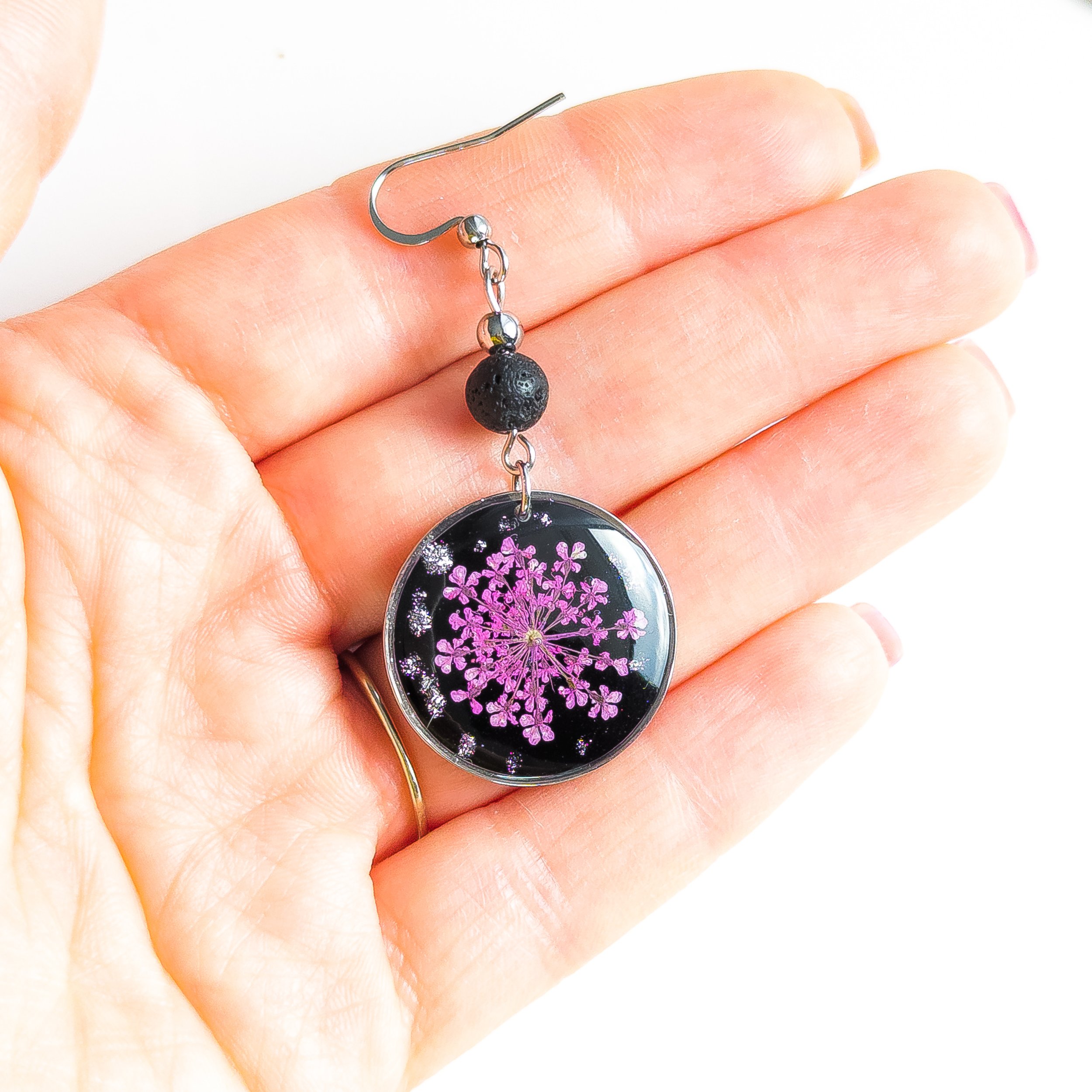 A delicate necklace with dandelion seeds embedded in resin on a black background creates an elegant, slightly magical piece of jewellery, perfect for lovers of nature and minimalism.