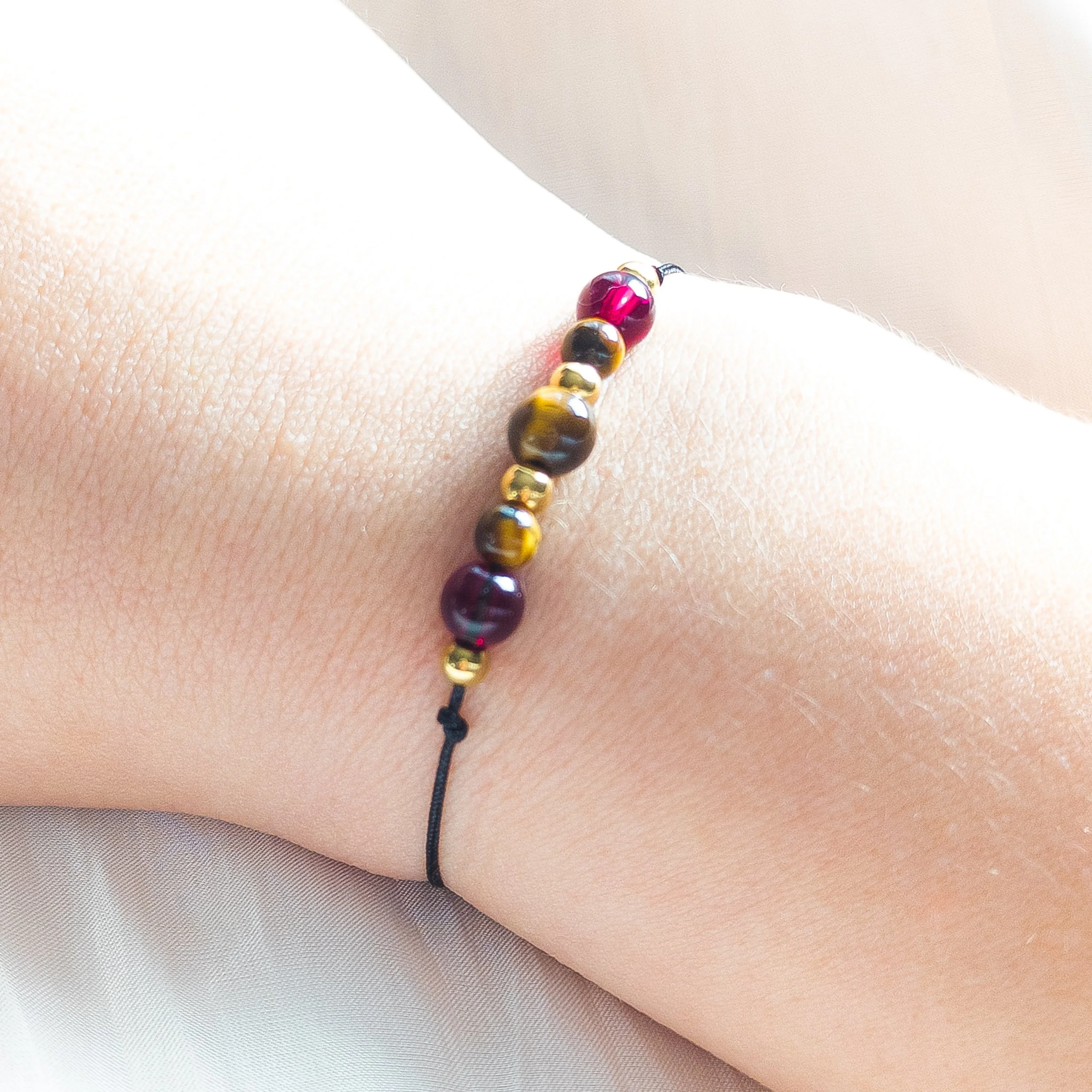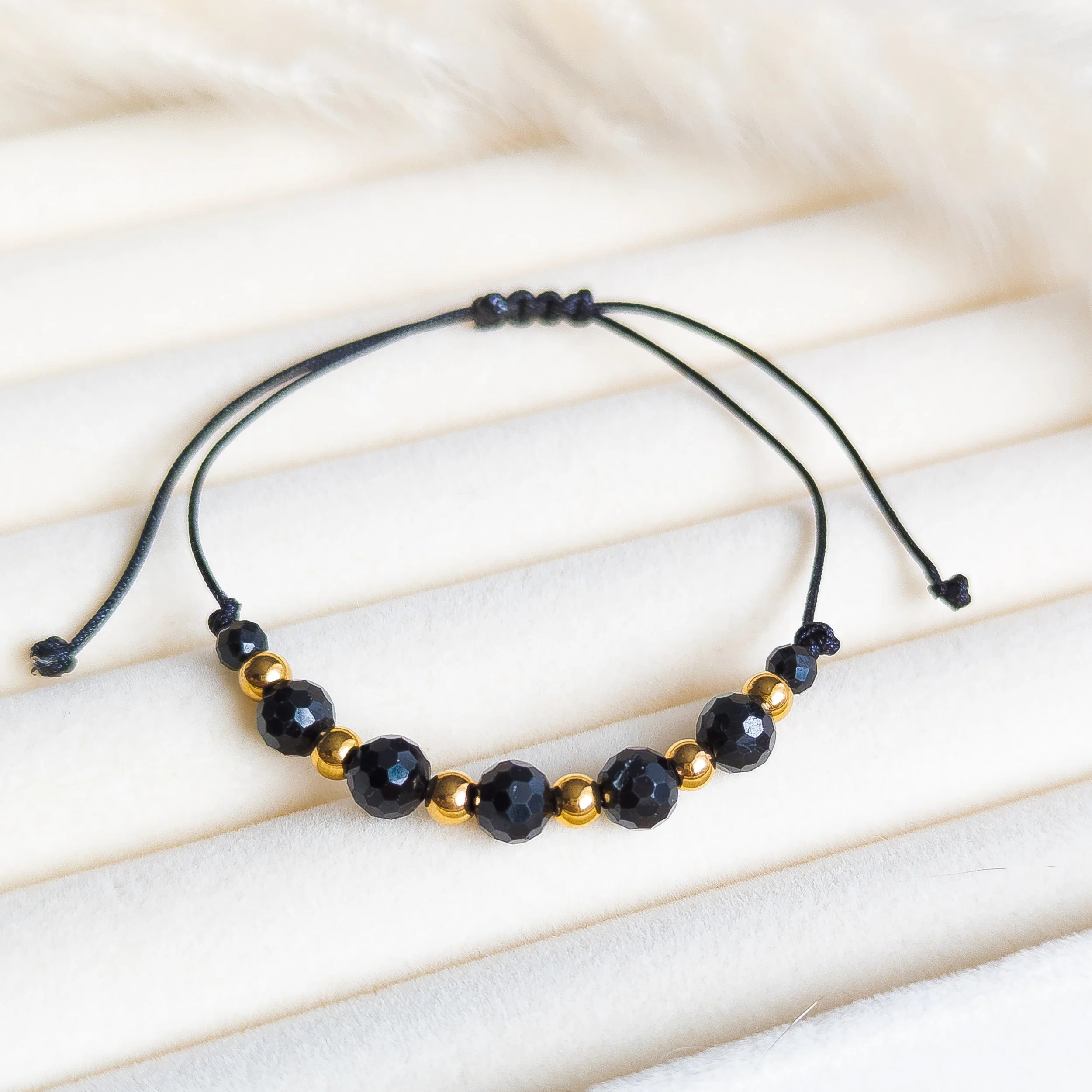 Bracelet made with smooth, natural black tourmaline beads and golden stainless steel details. The centre features a round pendant with a real four-leaf clover and gold leaf accents. The adjustable nylon cord and sliding macrame clasp ensure a comfortable fit for most wrist sizes.